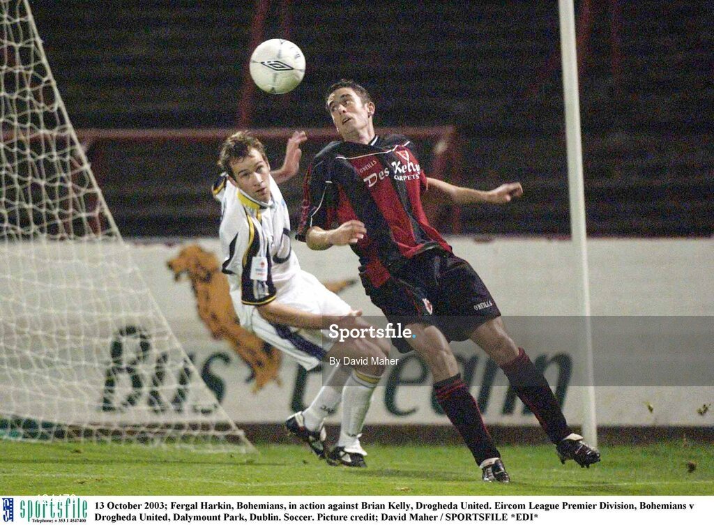 13 October 2003; Fergal Harkin, Bohemians, in action against Brian Kelly, Drogheda United. Eircom League Premier Division, Bohemians v Drogheda United, Dalymount Park, Dublin. Soccer. Picture credit; David Maher / SPORTSFILE *EDI*