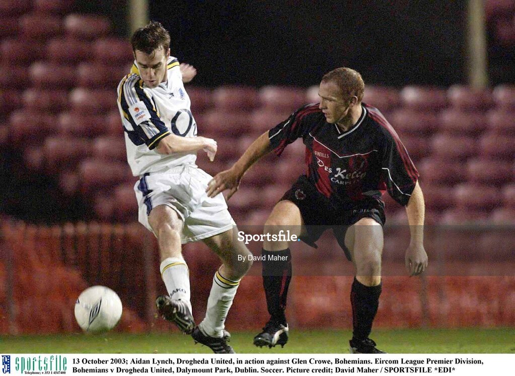 13 October 2003; Aidan Lynch, Drogheda United, in action against Glen Crowe, Bohemians. Eircom League Premier Division, Bohemians v Drogheda United, Dalymount Park, Dublin. Soccer. Picture credit; David Maher / SPORTSFILE *EDI*