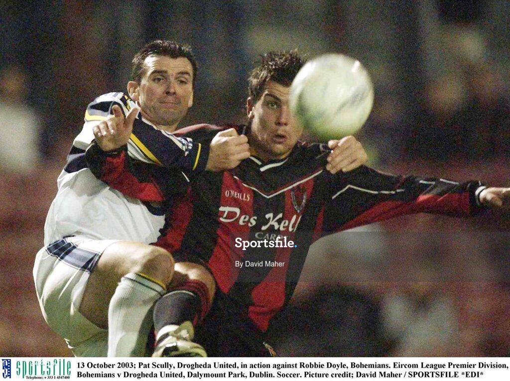 13 October 2003; Pat Scully, Drogheda United, in action against Robbie Doyle, Bohemians. Eircom League Premier Division, Bohemians v Drogheda United, Dalymount Park, Dublin. Soccer. Picture credit; David Maher / SPORTSFILE *EDI*