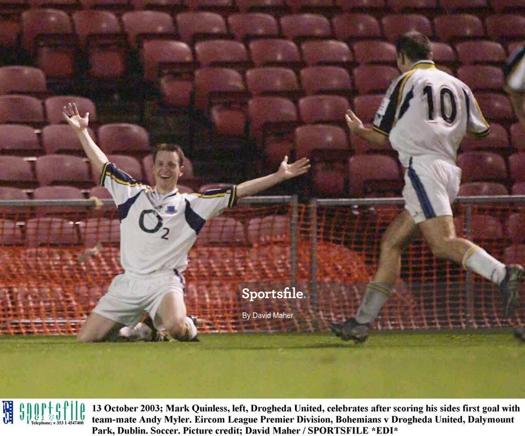 13 October 2003; Mark Quinless, left, Drogheda United, celebrates after scoring his sides first goal with team-mate Andy Myler. Eircom League Premier Division, Bohemians v Drogheda United, Dalymount Park, Dublin. Soccer. Picture credit; David Maher / SPORTSFILE *EDI*