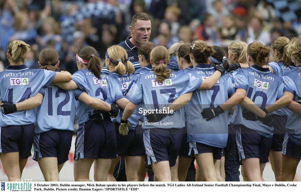 5 October 2003; Dublin manager, Mick Bohan speaks to his players before the match. TG4 Ladies All-Ireland Senior Football Championship Final, Mayo v Dublin, Croke Park, Dublin. Picture credit; Damien Eagers / SPORTSFILE *EDI*