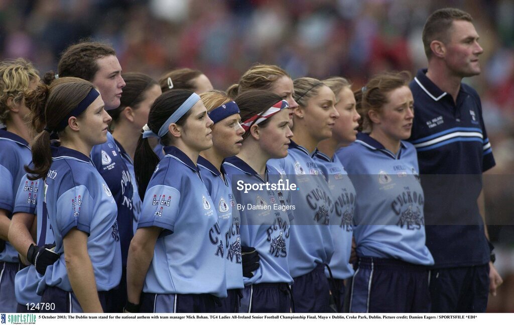 5 October 2003; The Dublin team stand for the national anthem with team manager Mick Bohan. TG4 Ladies All-Ireland Senior Football Championship Final, Mayo v Dublin, Croke Park, Dublin. Picture credit; Damien Eagers / SPORTSFILE *EDI*