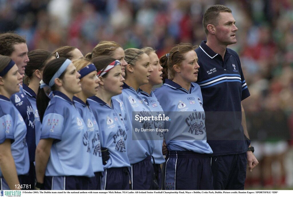 5 October 2003; The Dublin team stand for the national anthem with team manager Mick Bohan. TG4 Ladies All-Ireland Senior Football Championship Final, Mayo v Dublin, Croke Park, Dublin. Picture credit; Damien Eagers / SPORTSFILE *EDI*