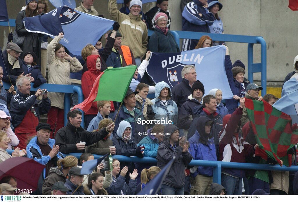 5 October 2003; Dublin and Mayo supporters cheer on their teams from Hill 16. TG4 Ladies All-Ireland Senior Football Championship Final, Mayo v Dublin, Croke Park, Dublin. Picture credit; Damien Eagers / SPORTSFILE *EDI*