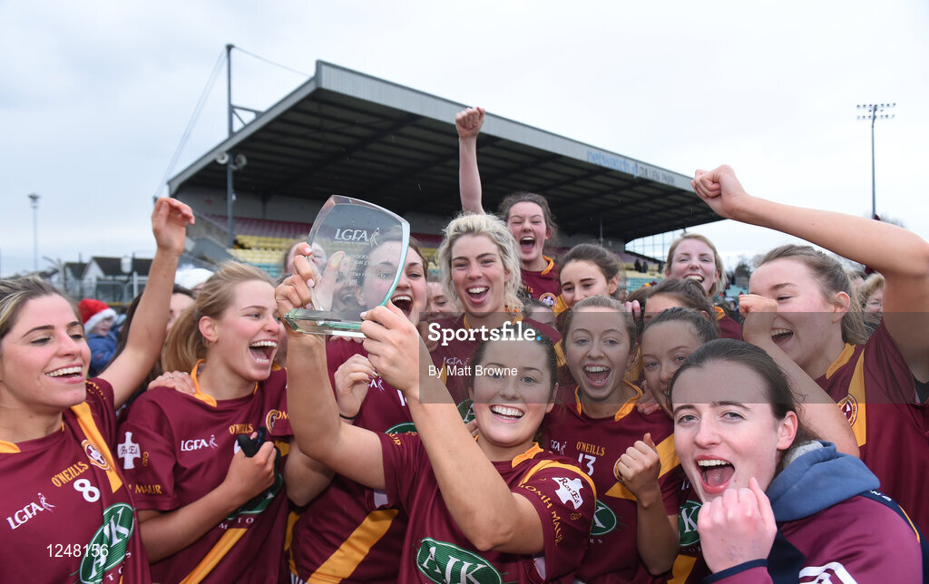 3 December 2016; Player of the match Olivia Leonard of Kinsale celebrates with her team-mates after the All Ireland Junior Club Championship Final 2016 match between Kinsale and St. Maurs at Dr Cullen Park in Carlow. Photo by Matt Browne/Sportsfile