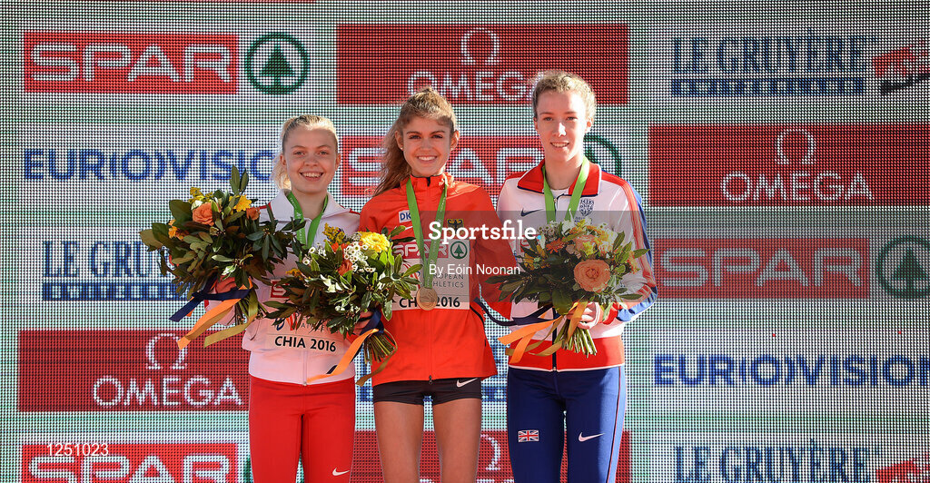 11 December 2016; Anna Emile Møller of Denmark, second place, left, Konstanze Klosterhalfen of Germany, first place, centre, and Harriet Knowles-Jones of Great Britain, third place, right, during the under 20 Women's race medal presentations at the 2016 Spar European Cross Country Championships in Chia, Italy. Photo by Eóin Noonan/Sportsfile