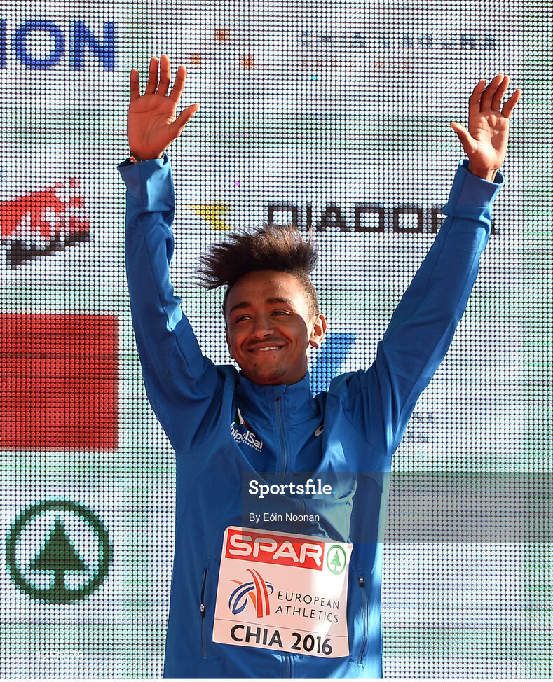 11 December 2016; Yemaneberhan Crippa of Italy who came third place in the mens under 23 race during the medal presentation at the 2016 Spar European Cross Country Championships in Chia, Italy. Photo by Eóin Noonan/Sportsfile