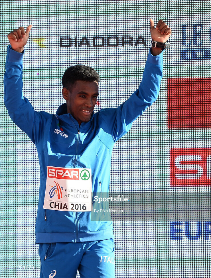 11 December 2016; Yohanes Chiappinelli who came second place in the mens under 20 race during the medal presentation at the 2016 Spar European Cross Country Championships in Chia, Italy. Photo by Eóin Noonan/Sportsfile