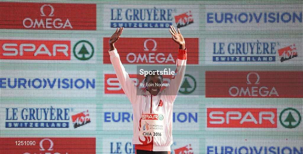 11 December 2016; Yasemin Can of Turkey who came first place in the womens senior race during the medal presentation at the 2016 Spar European Cross Country Championships in Chia, Italy. Photo by Eóin Noonan/Sportsfile