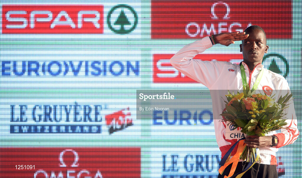 11 December 2016; Aras Kaya of Turkey who came first place in the mens senior race salutes the Turkey flag during the medal presentation at the 2016 Spar European Cross Country Championships in Chia, Italy. Photo by Eóin Noonan/Sportsfile