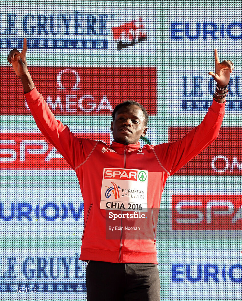 11 December 2016; Isaac Kimeli of Belgium who came first place in the mens under 23 race during the medal presentation at the 2016 Spar European Cross Country Championships in Chia, Italy. Photo by Eóin Noonan/Sportsfile