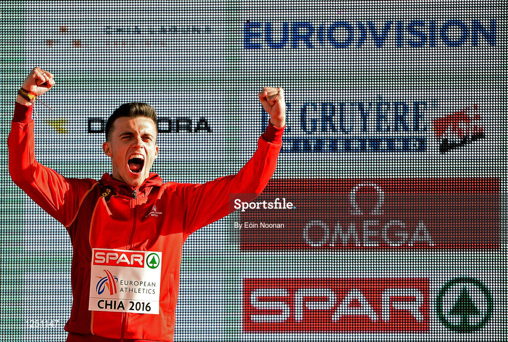 11 December 2016; Carlos Mayo of Spain who came secoond place in the mens under 23 race during the medal presentation at the 2016 Spar European Cross Country Championships in Chia, Italy. Photo by Eóin Noonan/Sportsfile