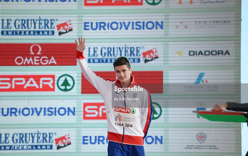 11 December 2016; Callum Hawkins of Great Britain who came third place in the mens senior race during the medal presentation at the 2016 Spar European Cross Country Championships in Chia, Italy. Photo by Eóin Noonan/Sportsfile