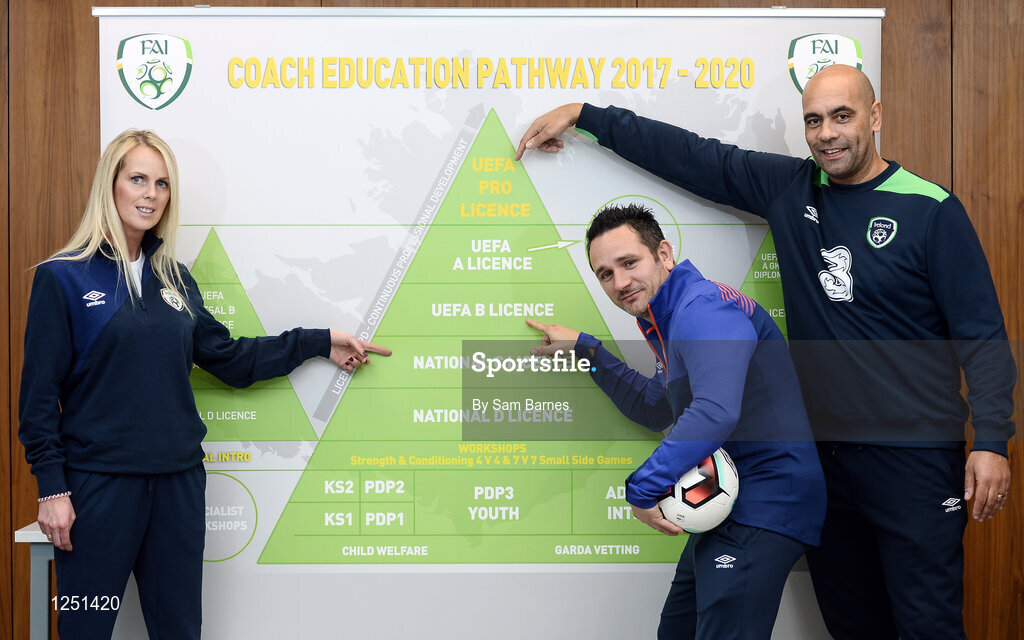 12 December 2016; Coaches Barbara O'Connell, left, and Marcus Grant with Republic of Ireland U16 Manager Paul Osam, right, during the FAI Coach Education Pathway 2017-2020 Launch at FAI HQ in Abbotstown, Dublin. Photo by Sam Barnes/Sportsfile