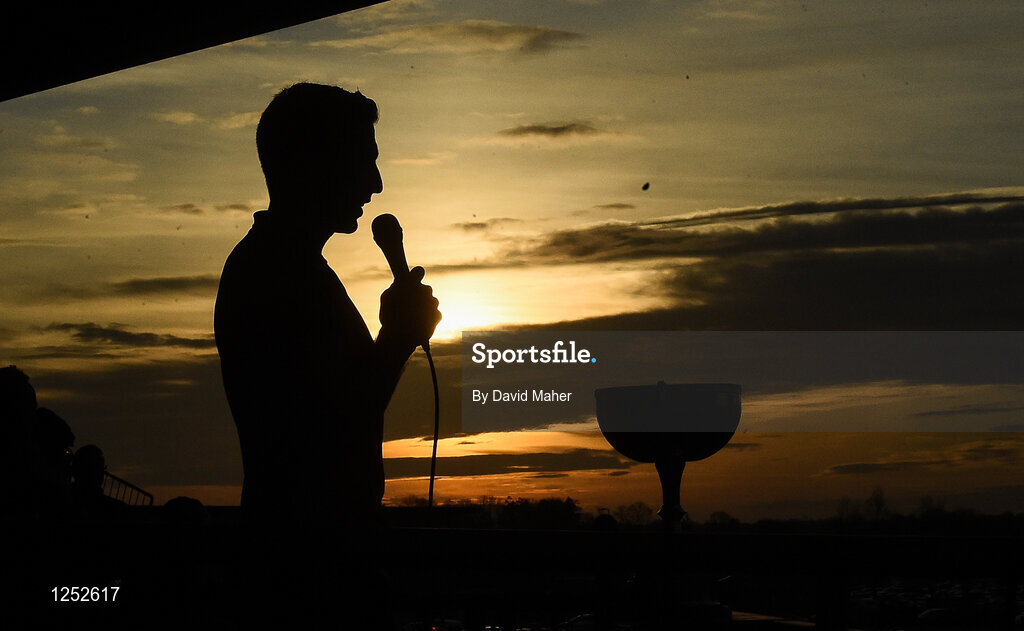17 December 2016; Ulster captain Eóin Donnelly speaks to the crowd after the GAA Interprovincial Football Championship Final match between Connacht and Ulster at Páirc Seán Mac Diarmada, Carrick-on-Shannon, Leitrim. Photo by David Maher/Sportsfile