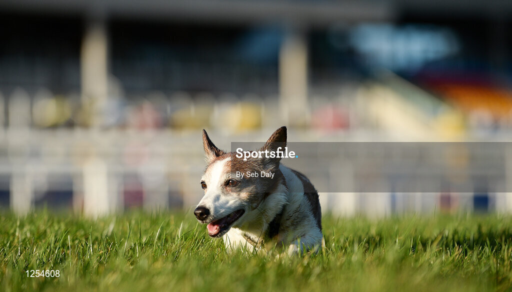 28 December 2016; Otter the jack russell plays out on the course ahead of day three of the Leopardstown Christmas Festival in Leopardstown, Dublin. Photo by Seb Daly/Sportsfile