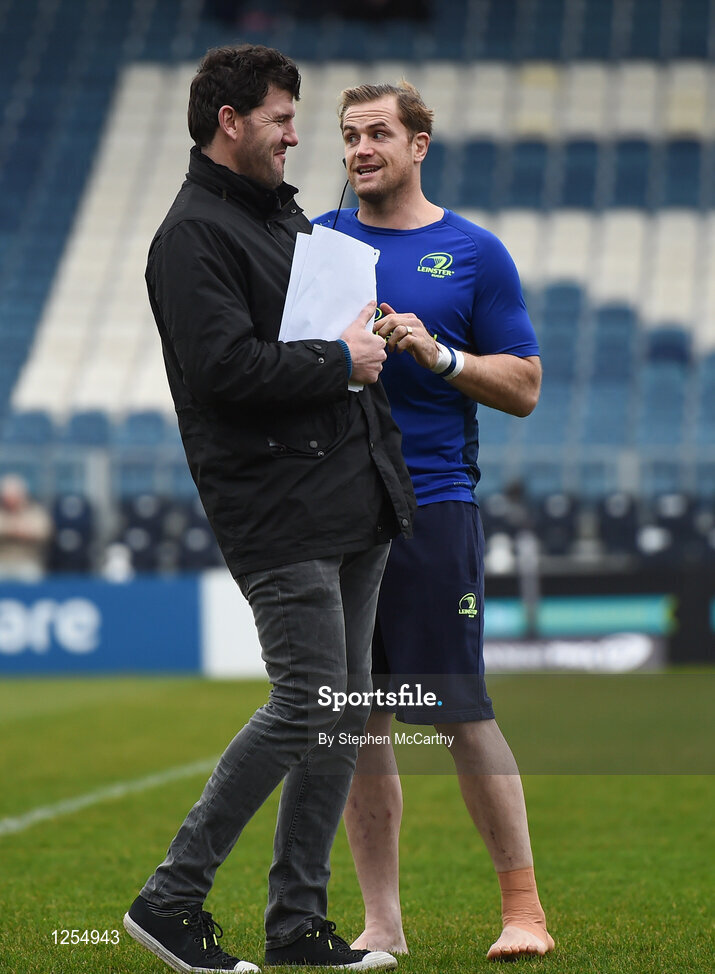 31 December 2016; Former Leinster and Ireland winger Shane Horgan in conversation with Jamie Heaslip of Leinster prior to the Guinness PRO12 Round 12 match between Leinster and Ulster at the RDS Arena in Dublin. Photo by Stephen McCarthy/Sportsfile