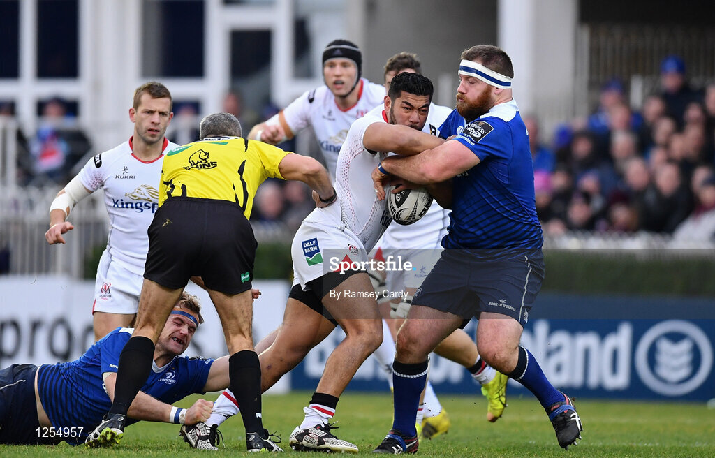 31 December 2016; Charles Piutau of Ulster is tackled by Michael Bent of Leinster during the Guinness PRO12 Round 12 match between Leinster and Ulster at the RDS Arena in Dublin. Photo by Ramsey Cardy/Sportsfile
