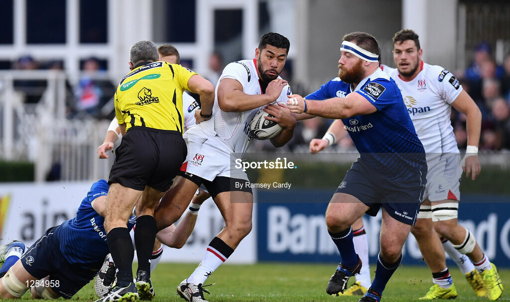 31 December 2016; Charles Piutau of Ulster is tackled by Michael Bent of Leinster during the Guinness PRO12 Round 12 match between Leinster and Ulster at the RDS Arena in Dublin. Photo by Ramsey Cardy/Sportsfile