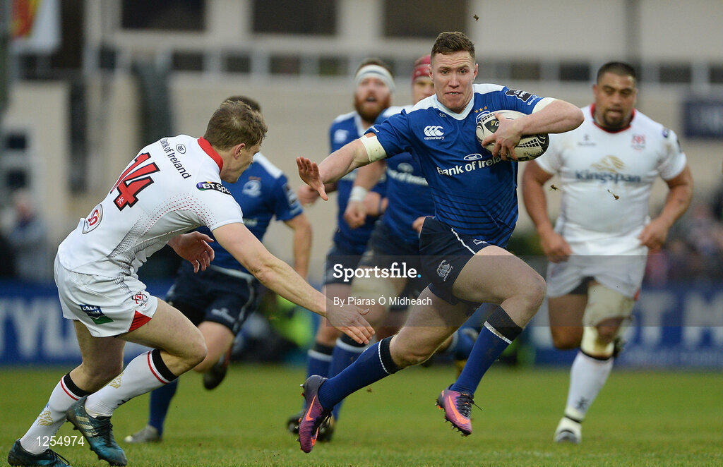 31 December 2016; Rory O’Loughlin of Leinster gets past Andrew Trimble of Ulster on his way to scoring his side's first try during the Guinness PRO12 Round 12 match between Leinster and Ulster at the RDS Arena in Dublin. Photo by Piaras Ó Mídheach/Sportsfile