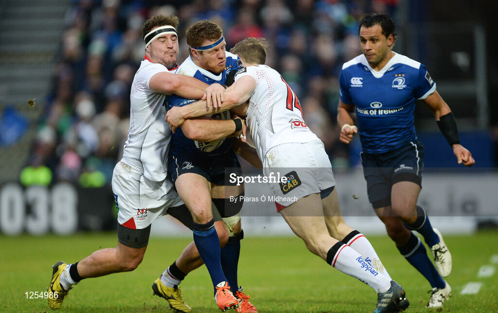 31 December 2016; Sean Cronin of Leinster, supported by team-mate Isa Nacewa, is tackled by Rob Herring and Andrew Trimble of Ulster, right, during the Guinness PRO12 Round 12 match between Leinster and Ulster at the RDS Arena in Dublin. Photo by Piaras Ó Mídheach/Sportsfile