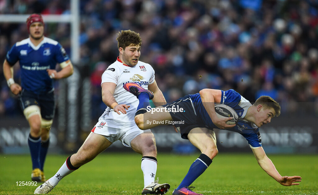 31 December 2016; Garry Ringrose of Leinster evades the tackle from John Andrew of Ulster during the Guinness PRO12 Round 12 match between Leinster and Ulster at the RDS Arena in Dublin. Photo by David Fitzgerald/Sportsfile