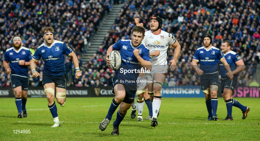 31 December 2016; Luke McGrath of Leinster on his way to scoring his side's second try during the Guinness PRO12 Round 12 match between Leinster and Ulster at the RDS Arena in Dublin. Photo by Piaras Ó Mídheach/Sportsfile