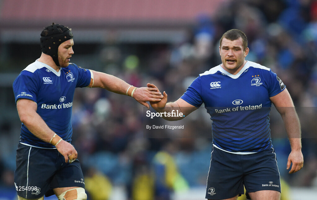 31 December 2016; Jack McGrath, right, and Sean O’Brien of Leinster celebrate their side's second try during the Guinness PRO12 Round 12 match between Leinster and Ulster at the RDS Arena in Dublin. Photo by David Fitzgerald/Sportsfile
