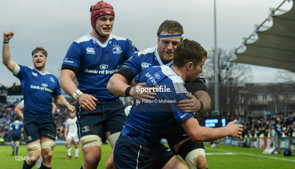 31 December 2016; Luke McGrath of Leinster, front, celebrates scoring his side's second try with team-mates Sean Cronin and Josh van der Flier, behind, during the Guinness PRO12 Round 12 match between Leinster and Ulster at the RDS Arena in Dublin. Photo by Piaras Ó Mídheach/Sportsfile