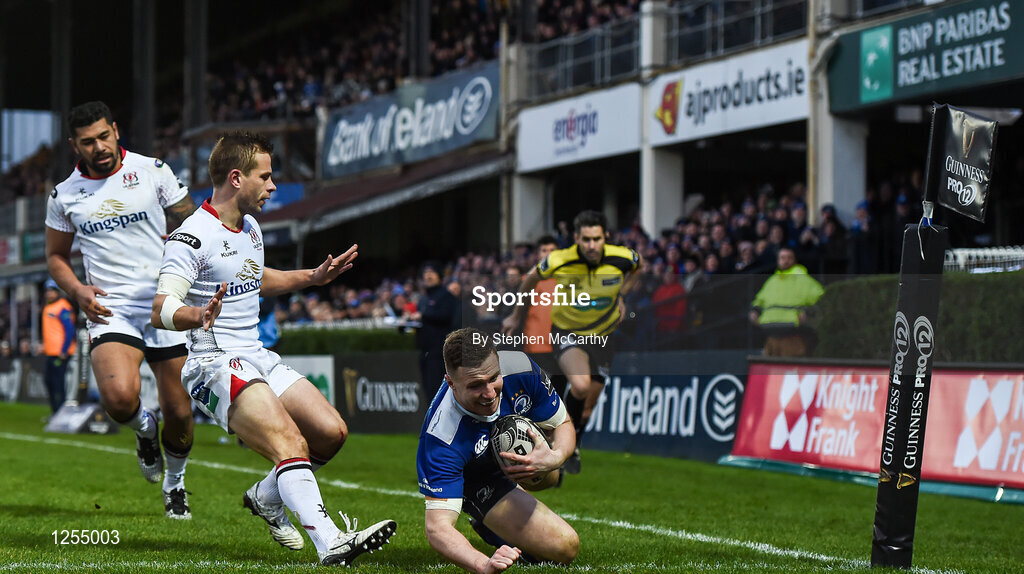 31 December 2016; Rory O'Loughlin of Leinster goes over to score his side's third try during the Guinness PRO12 Round 12 match between Leinster and Ulster at the RDS Arena in Dublin. Photo by Stephen McCarthy/Sportsfile