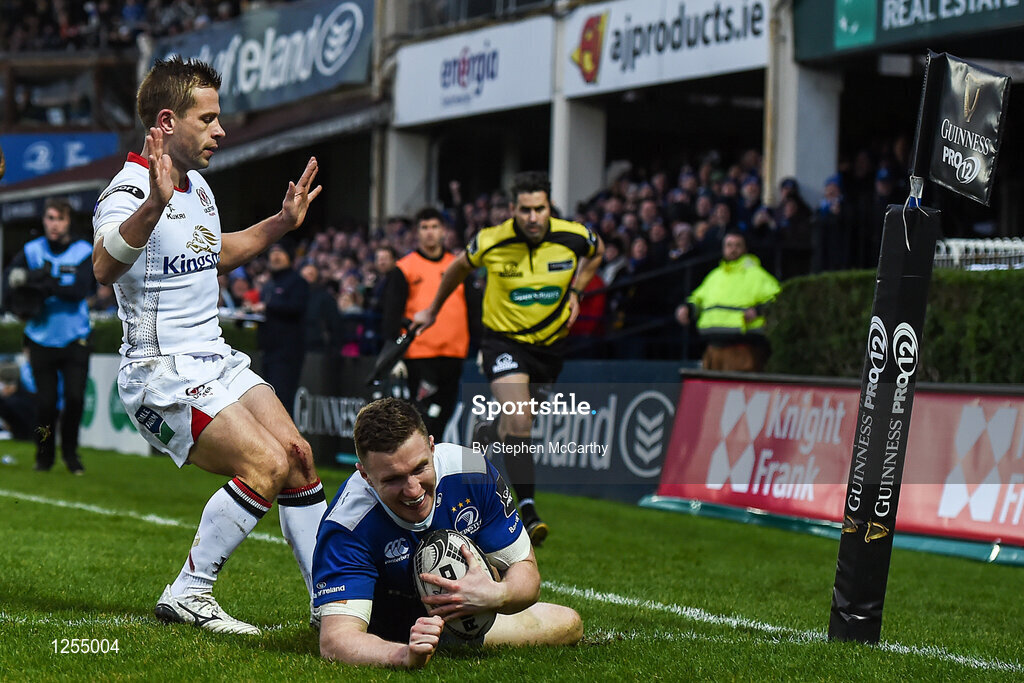 31 December 2016; Rory O'Loughlin of Leinster goes over to score his side's third try during the Guinness PRO12 Round 12 match between Leinster and Ulster at the RDS Arena in Dublin. Photo by Stephen McCarthy/Sportsfile