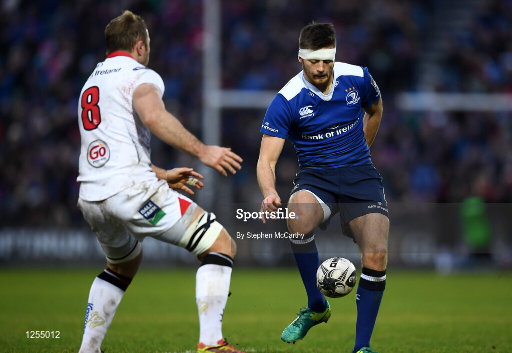 31 December 2016; Ross Byrne of Leinster kicks through to assist in the team-mate Rory O'Loughlin scoring their side's third try during the Guinness PRO12 Round 12 match between Leinster and Ulster at the RDS Arena in Dublin. Photo by Stephen McCarthy/Sportsfile