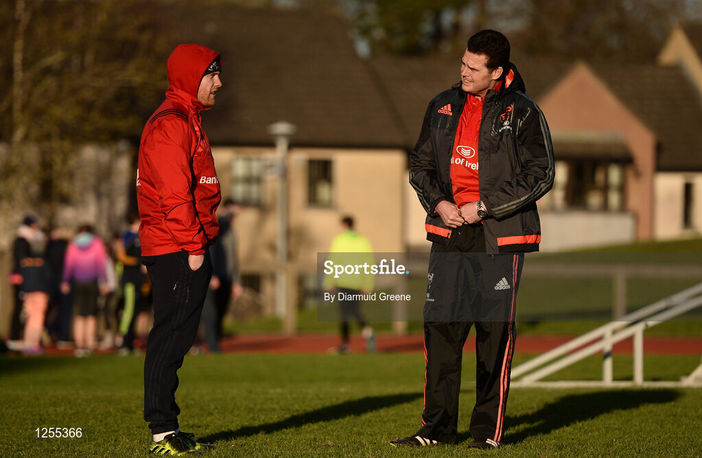 2 January 2017; Munster director of rugby Rassie Erasmus in conversation with Keith Earls during squad training at University of Limerick in Limerick. Photo by Diarmuid Greene/Sportsfile