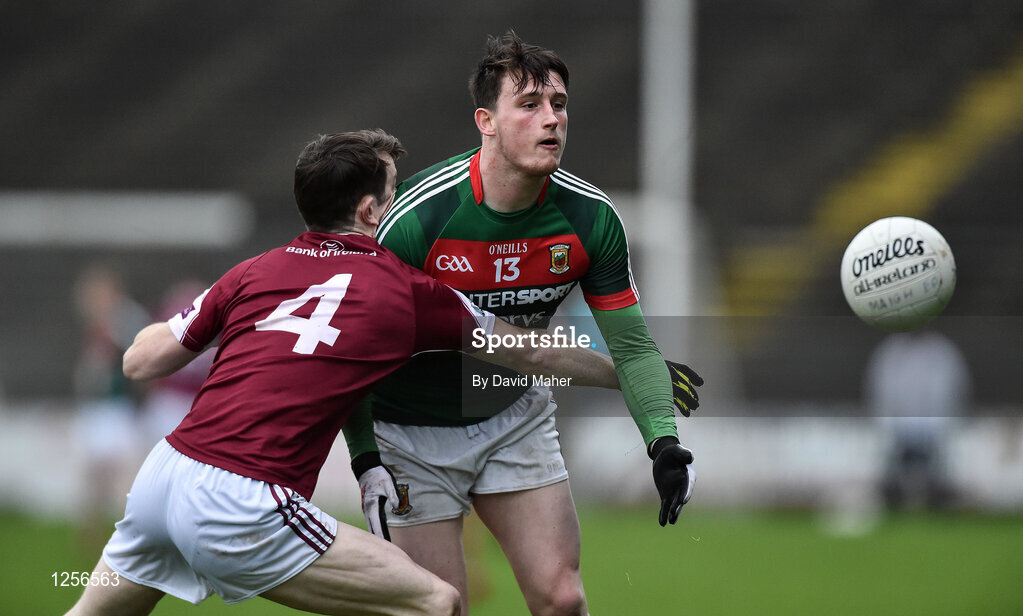 8 January 2017; Liam Irwin of Mayo in action against Aaron OConnor of NUIG during the Connacht FBD League Section A Round 1 match between Mayo and NUI Galway at Elvery's MacHale Park in Castlebar, Co. Mayo. Photo by David Maher/Sportsfile