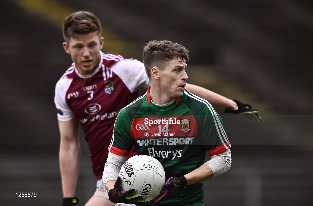 8 January 2017; Neil Douglas of Mayo in action against James Kennedy of NUIG during the Connacht FBD League Section A Round 1 match between Mayo and NUI Galway at Elvery's MacHale Park in Castlebar, Co. Mayo. Photo by David Maher/Sportsfile