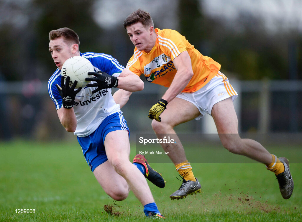 15 January 2017; Michael Bannigan of Monaghan in action against Conor Hamill of Antrim during the Bank of Ireland Dr. McKenna Cup Section B Round 2 match between Antrim and Monaghan at Glenavy in Co. Antrim. Photo by Mark Marlow/Sportsfile