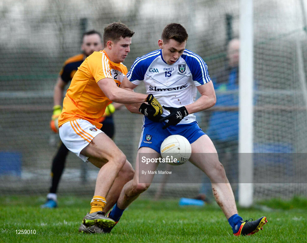 15 January 2017; Michael Bannigan of Monaghan in action against Conor Hamill of Antrim during the Bank of Ireland Dr. McKenna Cup Section B Round 2 match between Antrim and Monaghan at Glenavy in Co. Antrim. Photo by Mark Marlow/Sportsfile