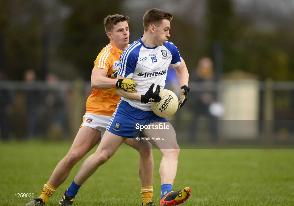 15 January 2017; Michael Bannigan of Monaghan in action against Conor Hamill of Antrim during the Bank of Ireland Dr. McKenna Cup Section B Round 2 match between Antrim and Monaghan at Glenavy in Co. Antrim. Photo by Mark Marlow/Sportsfile