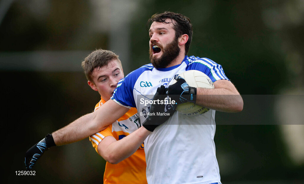 15 January 2017; Owen Coyle of Monaghan in action against Pat Brannigan of Antrim during the Bank of Ireland Dr. McKenna Cup Section B Round 2 match between Antrim and Monaghan at Glenavy in Co. Antrim. Photo by Mark Marlow/Sportsfile