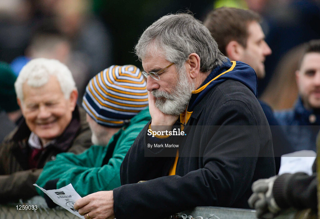 15 January 2017; Gerry Adams T.D. studies the team sheet during the Bank of Ireland Dr. McKenna Cup Section B Round 2 match between Antrim and Monaghan at Glenavy in Co. Antrim. Photo by Mark Marlow/Sportsfile