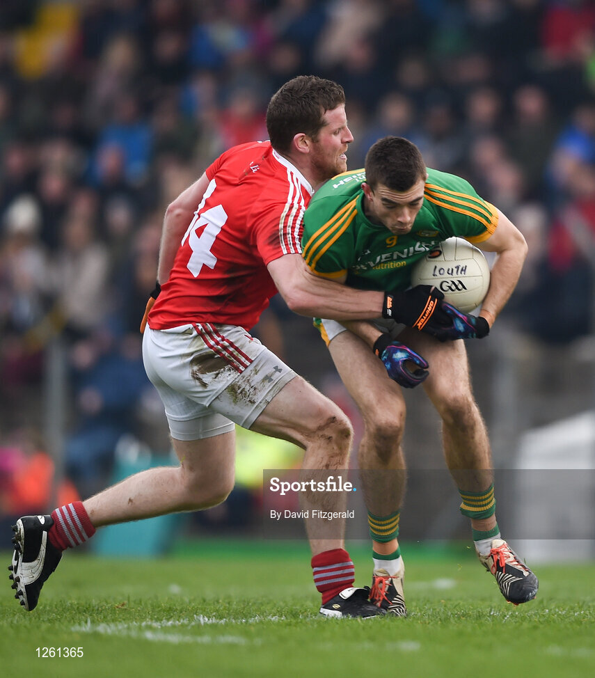 22 January 2017; Cian O'Brien of Meath in action against Ronan Carroll of Louth during the Bord na Mona O'Byrne Cup semi-final match between Meath and Louth at Páirc Táilteann in Navan, Co. Meath. Photo by David Fitzgerald/Sportsfile