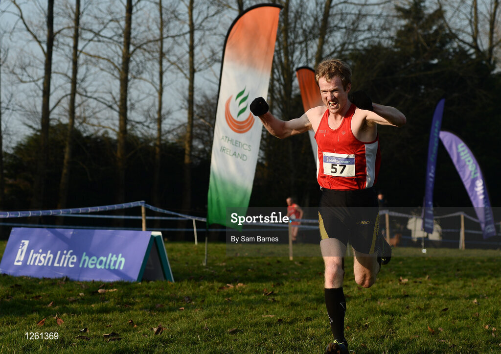 22 January 2017; Niall Sheehan of Gowran AC, Co Kilkenny, celebrates on his way to winning the Intermediate men's race during the Irish Life Health Intermediate & Juvenile Inter Club Relay at Palace Grounds in Tuam, Co.Galway. Photo by Sam Barnes/Sportsfile