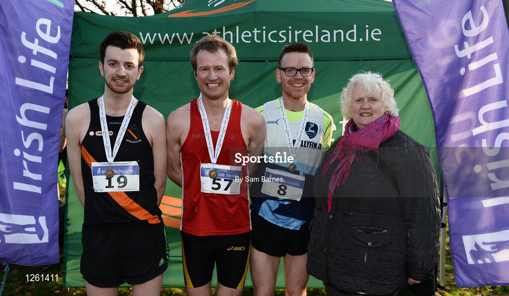 22 January 2017; Athletics Ireland president Georgina Drumm, right with men's intermediate medallists, from left, Ian Guiden of Clonliffe Harriers AC, bronze, Niall Sheehan of Gowran AC, gold, and Colin Maher of Ballyfin AC, silver, during the Irish Life Health Intermediate & Juvenile Inter Club Relay at Palace Grounds in Tuam, Co.Galway. Photo by Sam Barnes/Sportsfile