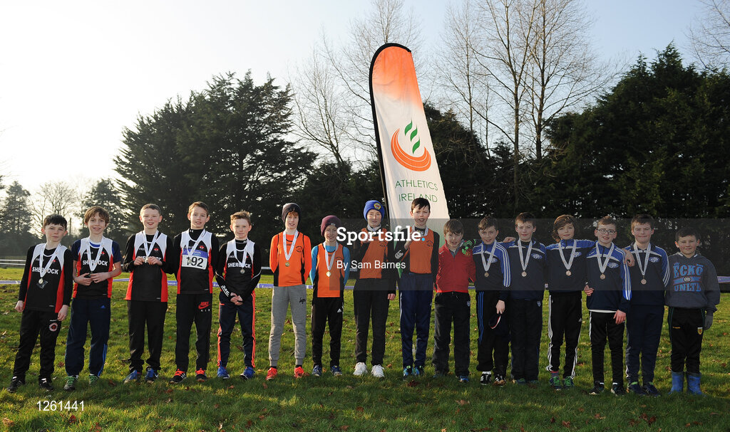 22 January 2017; Boys U12 relay medallists, from left, Shercock AC, bronze, Nenagh AC, gold, and Finn Valley AC, silver, after competing in the Irish Life Health Intermediate & Juvenile Inter Club Relay at Palace Grounds in Tuam, Co.Galway. Photo by Sam Barnes/Sportsfile