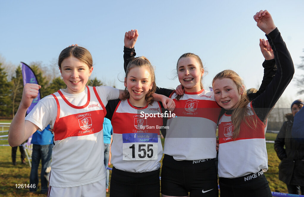 22 January 2017; The Galway City Harriers team, from left, Gillian McGrath, Emma Moore, Eimear Rowe and Ciara Dunne, after winning the Girl's U14 Relay event during the Irish Life Health Intermediate & Juvenile Inter Club Relay at Palace Grounds in Tuam, Co.Galway. Photo by Sam Barnes/Sportsfile