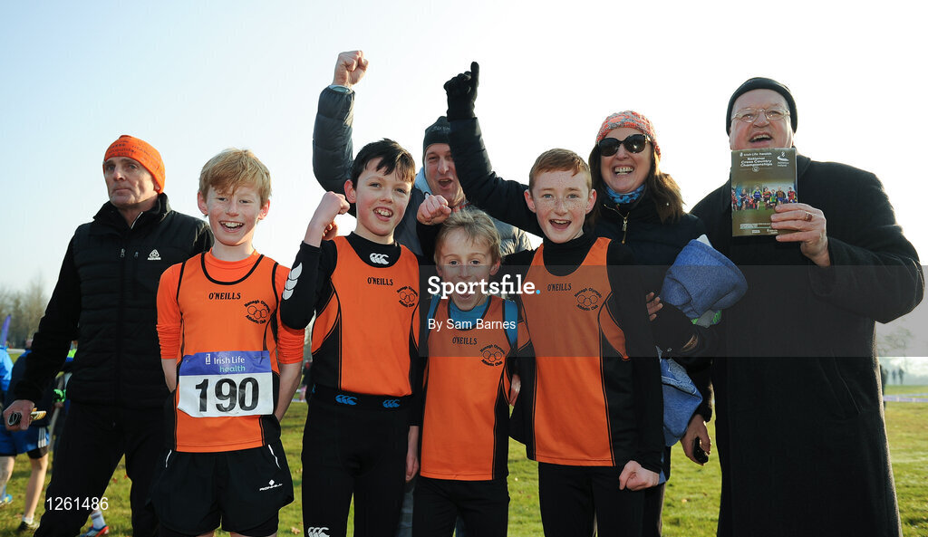 22 January 2017; The Nenagh AC team, from left, Tom Walshe, Cian Hodgins, Ben Walshe and Philip McIntyre, celebrate with family members after winning the boy's U12 event during the Irish Life Health Intermediate & Juvenile Inter Club Relay at Palace Grounds in Tuam, Co.Galway. Photo by Sam Barnes/Sportsfile