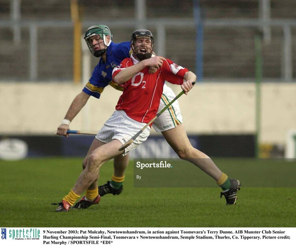 9 November 2003; Pat Mulcahy, Newtownshandrum, in action against Toomevara's Terry Dunne. AIB Munster Club Senior Hurling Championship Semi-Final, Toomevara v Newtownshandrum, Semple Stadium, Thurles, Co. Tipperary. Picture credit; Pat Murphy / SPORTSFILE *EDI*