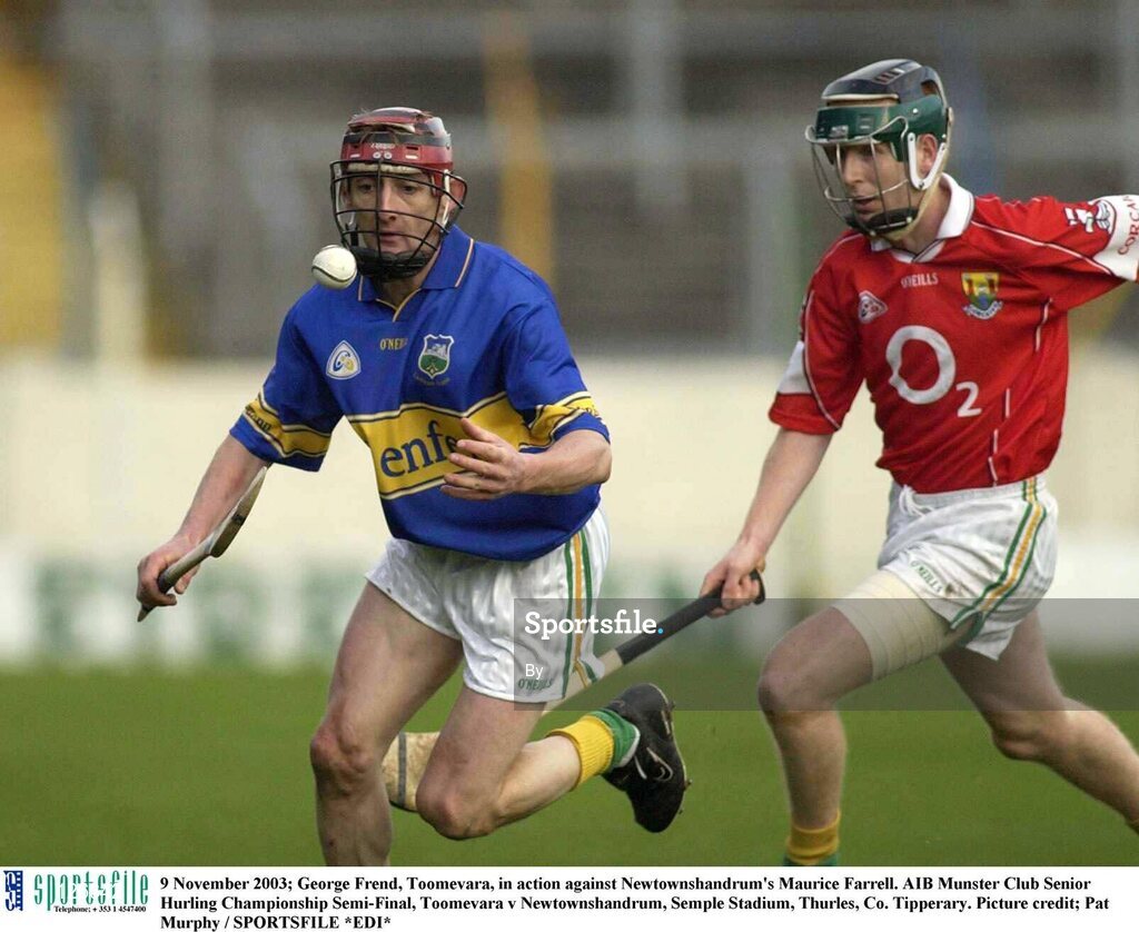 9 November 2003; George Frend, Toomevara, in action against Newtownshandrum's Maurice Farrell. AIB Munster Club Senior Hurling Championship Semi-Final, Toomevara v Newtownshandrum, Semple Stadium, Thurles, Co. Tipperary. Picture credit; Pat Murphy / SPORTSFILE *EDI*