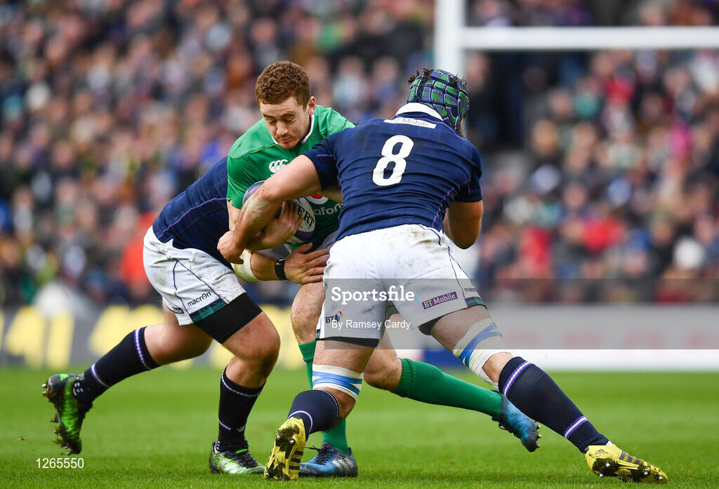4 February 2017; Paddy Jackson of Ireland is tackled by Zander Fagerson, left, and Josh Strauss of Scotland during the RBS Six Nations Rugby Championship match between Scotland and Ireland at BT Murrayfield Stadium in Edinburgh, Scotland. Photo by Ramsey Cardy/Sportsfile