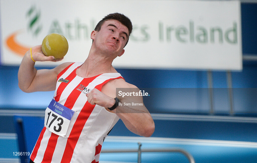 5 February 2017; Shane Aston of Trim AC, Co Meath, competing in the senior men's shot put during the Irish Life Health AAI Indoor Games at Sport Ireland National Indoor Arena in Abbotstown, Dublin. Photo by Sam Barnes/Sportsfile